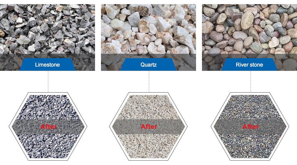 - Applied material: limestone, granite, basalt, quartz, river stone, ballast, quartz, gold ore, iron ore, andesite and so on.